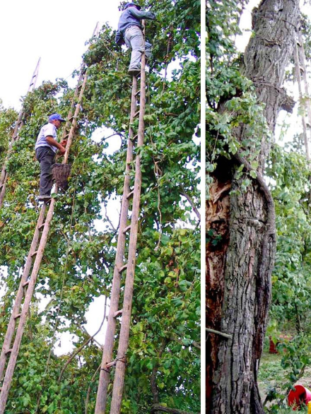 Cantine Bonaparte custodisce questo patrimonio con dedizione, portando avanti una vendemmia spettacolare: i nostri vignaioli si arrampicano tra i rami, in equilibrio su scale di legno altissime, per raccogliere grappoli che maturano sospesi nel vento.