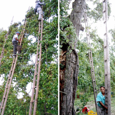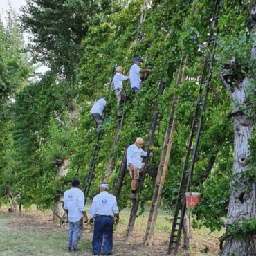 Cantine Bonaparte custodisce questo patrimonio con dedizione, portando avanti una vendemmia spettacolare: i nostri vignaioli si arrampicano tra i rami, in equilibrio su scale di legno altissime, per raccogliere grappoli che maturano sospesi nel vento.